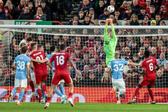 Melker Ellborg of Malmo FF punches the ball clear during the UEFA Europa League Matchday 5 of 8 Nottingham Forest vs Malmo FF at City Ground, Nottingham, United Kingdom, 27th November 2025, Credit:Mark Cosgrove/News Images / Avalon