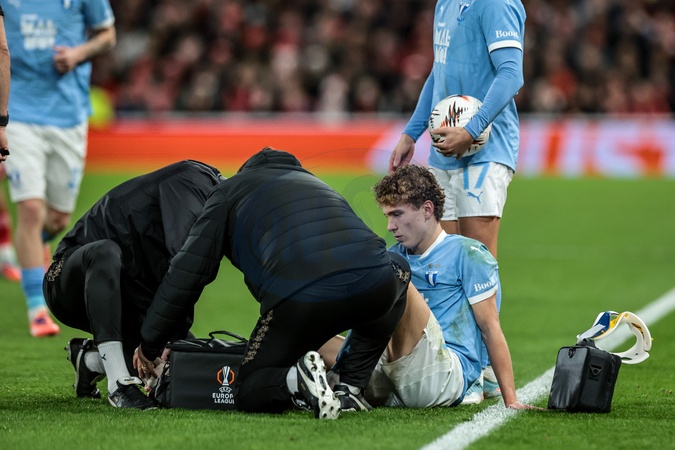 Hugo Bolin of Malmo FF receives treatment during the UEFA Europa League Matchday 5 of 8 Nottingham Forest vs Malmo FF at City Ground, Nottingham, United Kingdom, 27th November 2025, Credit:Mark Cosgrove/News Images / Avalon