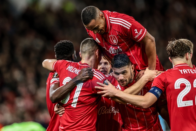 Nikola Milenkovic of Nottingham Forest celebrates his goal to make it 3-0 during the UEFA Europa League Matchday 5 of 8 Nottingham Forest vs Malmo FF at City Ground, Nottingham, United Kingdom, 27th November 2025, Credit:Mark Cosgrove/News Images / Avalon