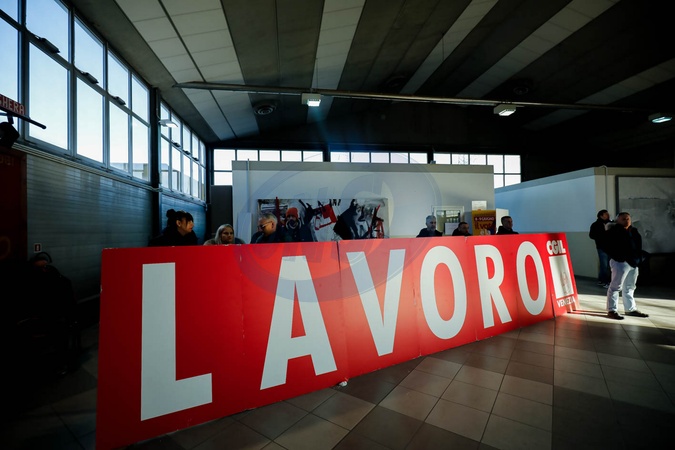 Maurizio Landini at the Marghera Petrochemical Plant warehouse to explain the reasons for the December 12 general strike. Margera, Italy 27 November 2025, Credit:Mirco Toniolo - Rbmultimedia / Avalon