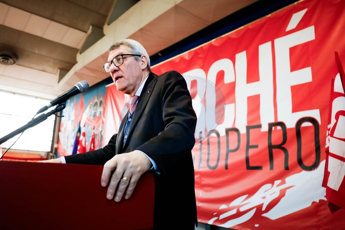 Maurizio Landini at the Marghera Petrochemical Plant warehouse to explain the reasons for the December 12 general strike. Margera, Italy 27 November 2025, Credit:Mirco Toniolo - Rbmultimedia / Avalon