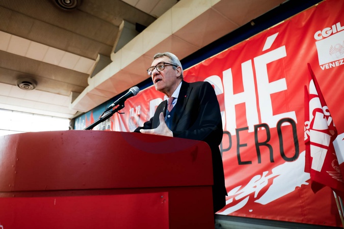 Maurizio Landini at the Marghera Petrochemical Plant warehouse to explain the reasons for the December 12 general strike. Margera, Italy 27 November 2025, Credit:Mirco Toniolo - Rbmultimedia / Avalon