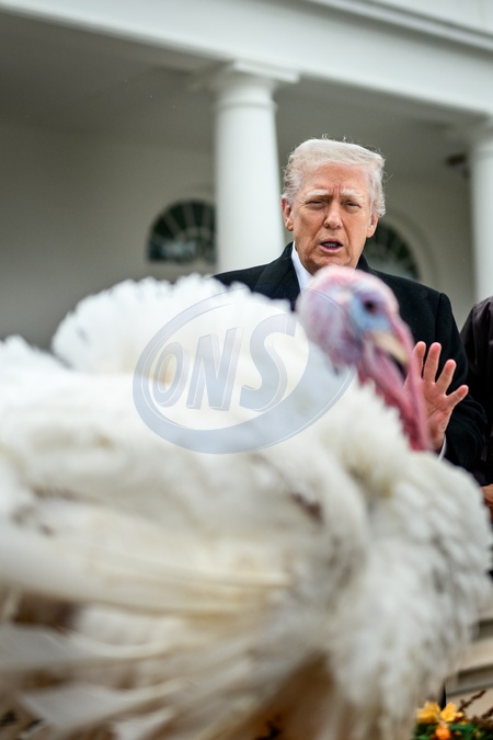President Donald Trump participates in the annual ceremony to pardon the national Thanksgiving turkeys, Tuesday, November 25, 2025, in the White House Rose Garden., Credit:Daniel Torok / Avalon