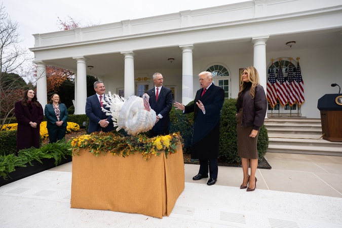 President Donald Trump and First Lady Melania Trump participate in the annual ceremony to pardon the national Thanksgiving turkeys, Tuesday, November 25, 2025, in the White House Rose Garden., Credit:Andrea Hanks / Avalon
