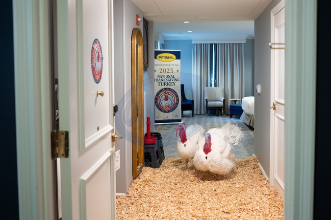 The 2025 Presidential Turkeys, named Gobble and Waddle, arrive at the Willard InterContinental Hotel in Washington, D.C., on Sunday, November 24, 2025., Credit:Andrea Hanks / Avalon