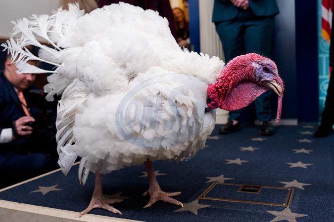The 2025 Presidential Turkeys, named Gobble and Waddle, hold a press briefing in the James E. Brady briefing room, along with White House Press Secretary, Karoline Leavitt, at the White House, Tuesday, November 25, 2025., Credit:Andrea Hanks / Avalon