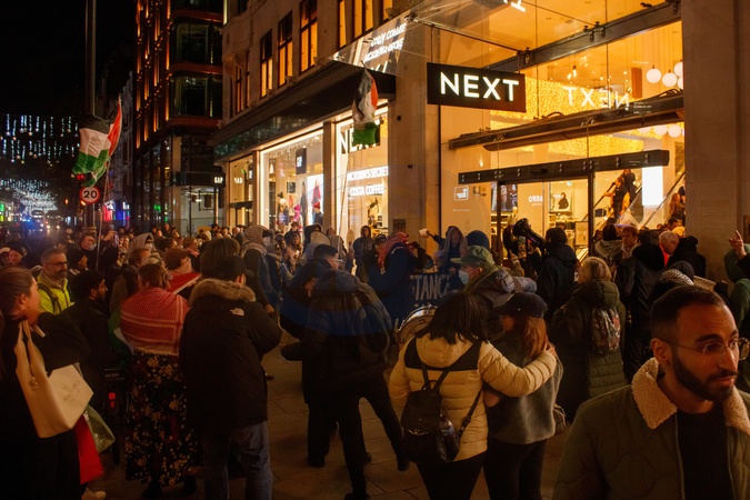 Palestine protesters from a range of groups, most notably Palestine Pulse target "Zionist" shops in and around Oxford Street during Black Friday, London, UK, 28 November 2025, Credit:Alex Day / Avalon