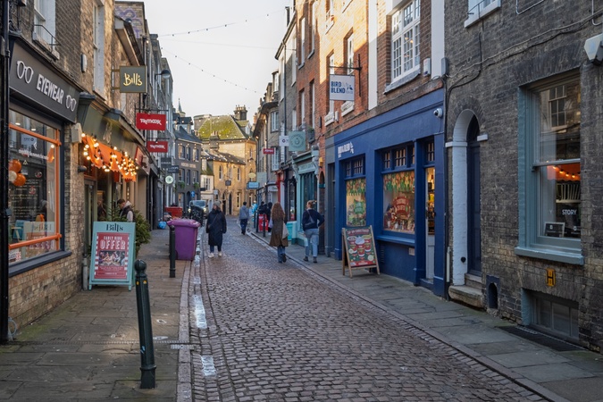 Green street a pleasant cobbled street in Cambridge with many independent shops. Cambridge, Cambridgeshire. United Kingdom. 28 November 2025, Credit:Mark Fairhurst / Avalon
