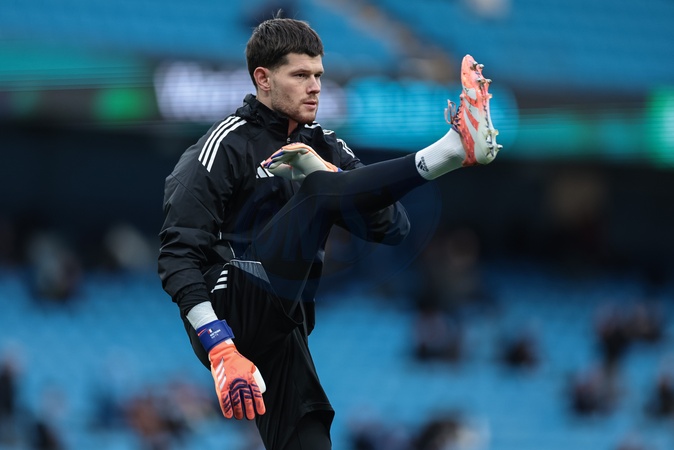 Leeds United goalkeeper Illan Meslier in the pregame warmup session during the Premier League match Manchester City vs Leeds United at Etihad Stadium, Manchester, United Kingdom, 29th November 2025, Credit:Mark Cosgrove/News Images / Avalon