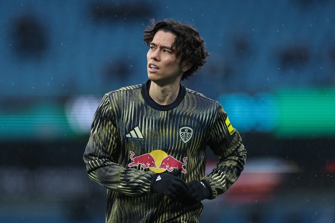 Ao Tanaka of Leeds United in the pregame warmup session during the Premier League match Manchester City vs Leeds United at Etihad Stadium, Manchester, United Kingdom, 29th November 2025, Credit:Mark Cosgrove/News Images / Avalon
