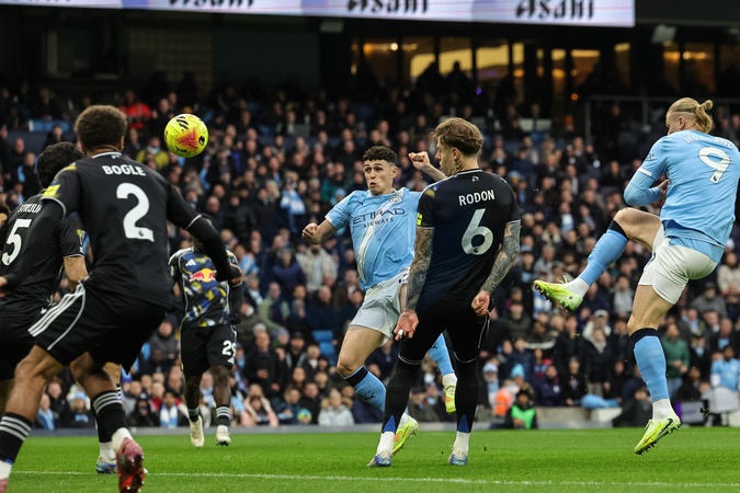 Phil Foden of Manchester City scores to make it 1-0 during the Premier League match Manchester City vs Leeds United at Etihad Stadium, Manchester, United Kingdom, 29th November 2025, Credit:Mark Cosgrove/News Images / Avalon
