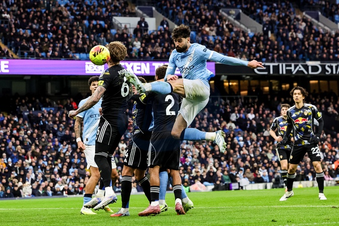 Josko Gvardiol of Manchester City shoots on goal during the Premier League match Manchester City vs Leeds United at Etihad Stadium, Manchester, United Kingdom, 29th November 2025, Credit:Mark Cosgrove/News Images / Avalon