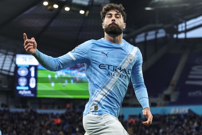 Josko Gvardiol of Manchester City celebrates his goal to make it 2-0 during the Premier League match Manchester City vs Leeds United at Etihad Stadium, Manchester, United Kingdom, 29th November 2025, Credit:Mark Cosgrove/News Images / Avalon