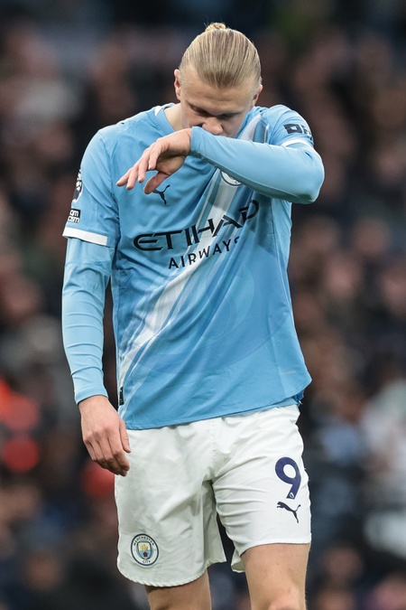 Erling Haaland of Manchester City wipes his face during the Premier League match Manchester City vs Leeds United at Etihad Stadium, Manchester, United Kingdom, 29th November 2025, Credit:Mark Cosgrove/News Images / Avalon
