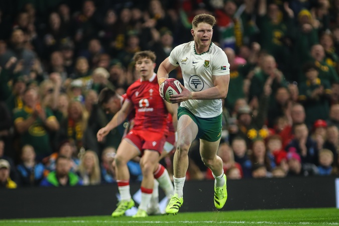 Ethan Hooker of South Africa scores a try for his team during the Quilter Nations Series 2025 match Wales vs South Africa at Principality Stadium, Cardiff, United Kingdom, 29th November 2025, Credit:Andrew Lewis/News Images / Avalon
