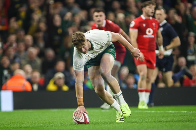Ethan Hooker of South Africa scores a try for his team during the Quilter Nations Series 2025 match Wales vs South Africa at Principality Stadium, Cardiff, United Kingdom, 29th November 2025, Credit:Andrew Lewis/News Images / Avalon