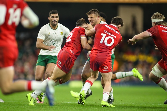 Andre Esterhuizen of South Africa is tackled by Dan Edwards of Wales during the Quilter Nations Series 2025 match Wales vs South Africa at Principality Stadium, Cardiff, United Kingdom, 29th November 2025, Credit:Andrew Lewis/News Images / Avalon