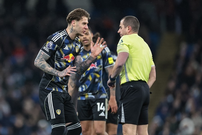 Joe Rodon of Leeds United confronts Referee Peter Bankes during the Premier League match Manchester City vs Leeds United at Etihad Stadium, Manchester, United Kingdom, 29th November 2025, Credit:Mark Cosgrove/News Images / Avalon