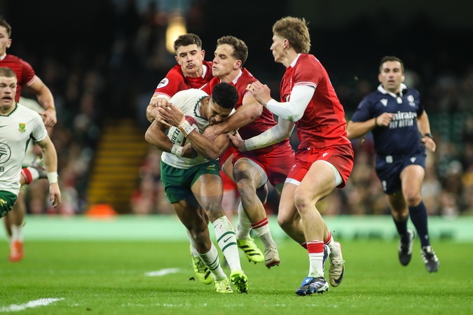 Sacha Feinberg-Mngomezulu of South Africa is tackled by the Welsh defence during the Quilter Nations Series 2025 match Wales vs South Africa at Principality Stadium, Cardiff, United Kingdom, 29th November 2025, Credit:Andrew Lewis/News Images / Avalon