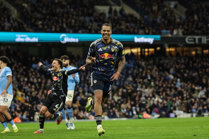 Lukas Nmecha of Leeds United scores to make it 2-2 during the Premier League match Manchester City vs Leeds United at Etihad Stadium, Manchester, United Kingdom, 29th November 2025, Credit:Mark Cosgrove/News Images / Avalon