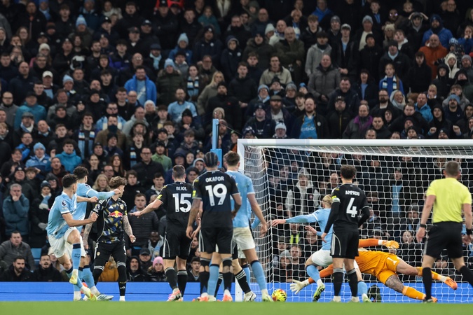 Phil Foden of Manchester City scores to make it 3-2c during the Premier League match Manchester City vs Leeds United at Etihad Stadium, Manchester, United Kingdom, 29th November 2025, Credit:Mark Cosgrove/News Images / Avalon
