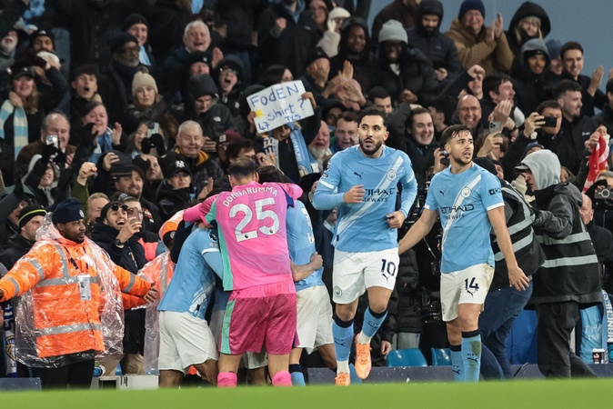Phil Foden of Manchester City celebrates his goal to make it 3-2 during the Premier League match Manchester City vs Leeds United at Etihad Stadium, Manchester, United Kingdom, 29th November 2025, Credit:Mark Cosgrove/News Images / Avalon