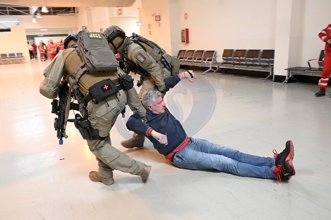 Counterterrorism exercise featuring simulated police and civil defense operations with the support of the Red Cross to test the response of hospitals in the capital.