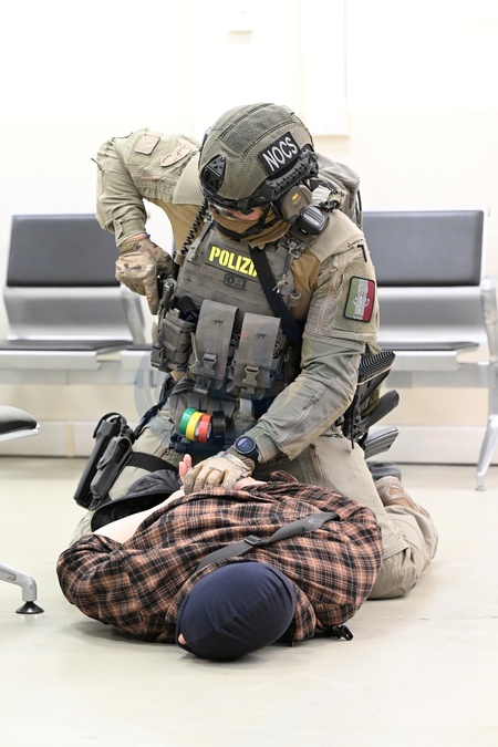 Leonardo Da Vinci Airport. Counterterrorism exercise with simulated police and civil defense operations, supported by the Italian Red Cross, to test the response of the capital's hospitals. Pictured is the NOCS special police unit. Fiumicino, Italy 29 November 2025, Credit:Maria Laura Antonelli / Avalon