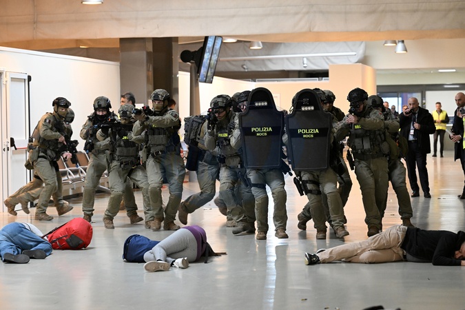 Leonardo Da Vinci Airport. Counterterrorism exercise with simulated police and civil defense operations, supported by the Italian Red Cross, to test the response of the capital's hospitals. Pictured is the NOCS special police unit. Fiumicino, Italy 29 November 2025, Credit:Maria Laura Antonelli / Avalon