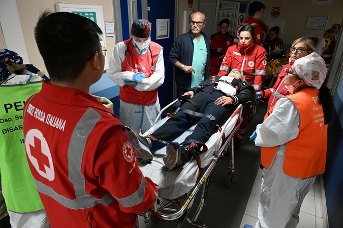 A counterterrorism exercise featuring simulated police and civil defense operations, supported by the Italian Red Cross, tested the response of the capital's hospitals. Pictured is a simulation of the injured arriving at the emergency room of San Camillo Hospital. Rome, Italy 29 November 2025, Credit:Maria Laura Antonelli / Avalon