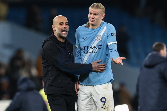 Pep Guardiola manager of Manchester City speaks with Erling Haaland of Manchester City after the final whistle during the Premier League match Manchester City vs Leeds United at Etihad Stadium, Manchester, United Kingdom, 29th November 2025, Credit:Mark Cosgrove/News Images / Avalon