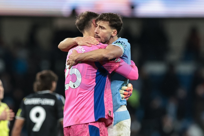 Manchester City goalkeeper Gianluigi Donnarumma embraces Ruben Dias of Manchester City during the Premier League match Manchester City vs Leeds United at Etihad Stadium, Manchester, United Kingdom, 29th November 2025, Credit:Mark Cosgrove/News Images / Avalon
