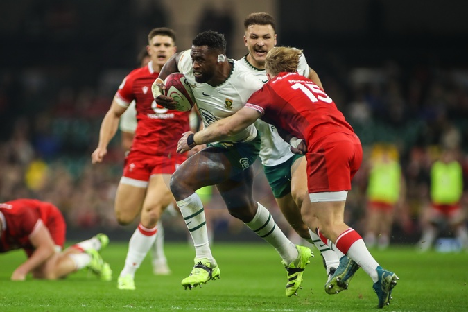 Siya Kolisi of South Africa is tackled by Blair Murray of Wales during the Quilter Nations Series 2025 match Wales vs South Africa at Principality Stadium, Cardiff, United Kingdom, 29th November 2025, Credit:Andrew Lewis/News Images / Avalon