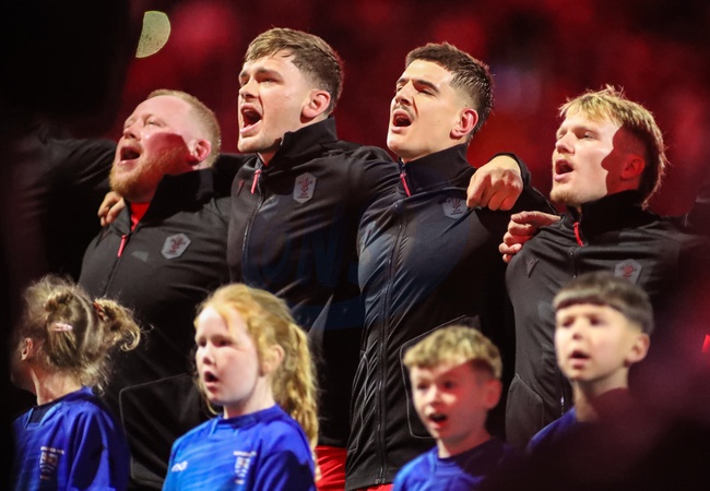 Welsh players sing the National Anthem during the Quilter Nations Series 2025 match Wales vs South Africa at Principality Stadium, Cardiff, United Kingdom, 29th November 2025, Credit:Andrew Lewis/News Images / Avalon