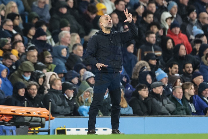 Pep Guardiola manager of Manchester City reacts in the technical area during the Premier League match Manchester City vs Leeds United at Etihad Stadium, Manchester, United Kingdom, 29th November 2025, Credit:Mark Cosgrove/News Images / Avalon