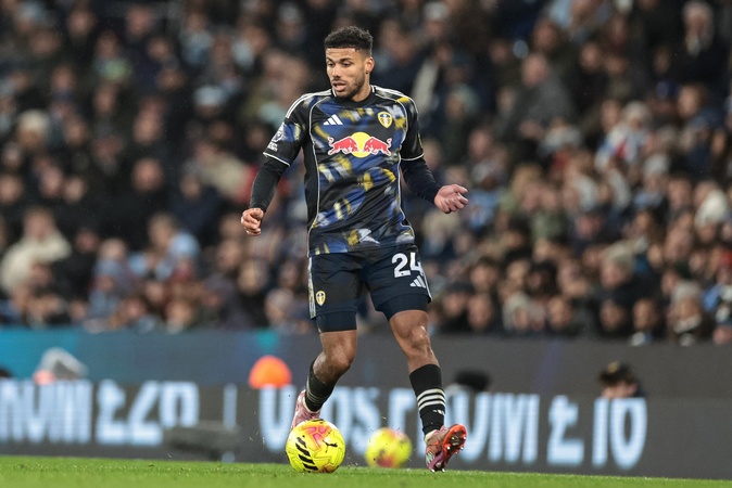 James Justin of Leeds United breaks with the ball during the Premier League match Manchester City vs Leeds United at Etihad Stadium, Manchester, United Kingdom, 29th November 2025, Credit:Mark Cosgrove/News Images / Avalon
