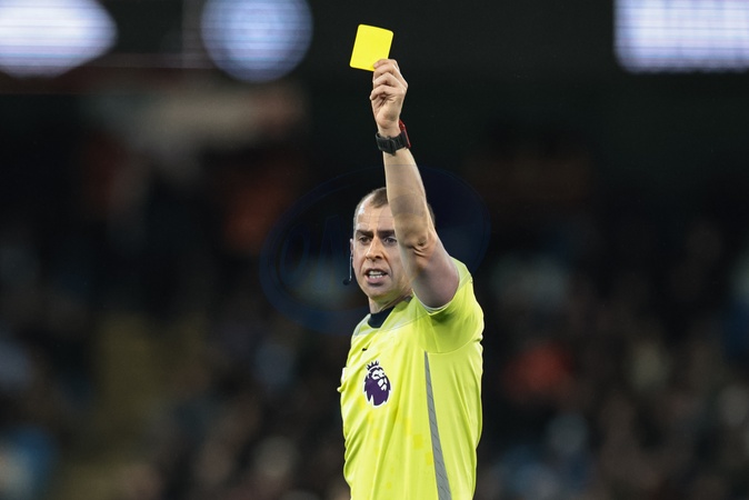 Referee Peter Bankes gives a yellow card to Manchester City goalkeeper Gianluigi Donnarumma during the Premier League match Manchester City vs Leeds United at Etihad Stadium, Manchester, United Kingdom, 29th November 2025, Credit:Mark Cosgrove/News Images / Avalon