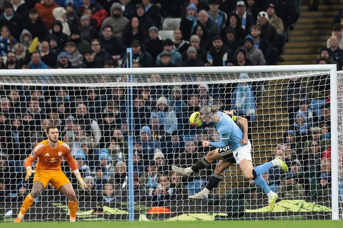 Erling Haaland of Manchester City heads on goal during the Premier League match Manchester City vs Leeds United at Etihad Stadium, Manchester, United Kingdom, 29th November 2025, Credit:Mark Cosgrove/News Images / Avalon