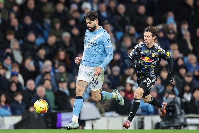 Josko Gvardiol of Manchester City breaks with the ball tracked by Brenden Aaronson of Leeds United during the Premier League match Manchester City vs Leeds United at Etihad Stadium, Manchester, United Kingdom, 29th November 2025, Credit:Mark Cosgrove/News Images / Avalon