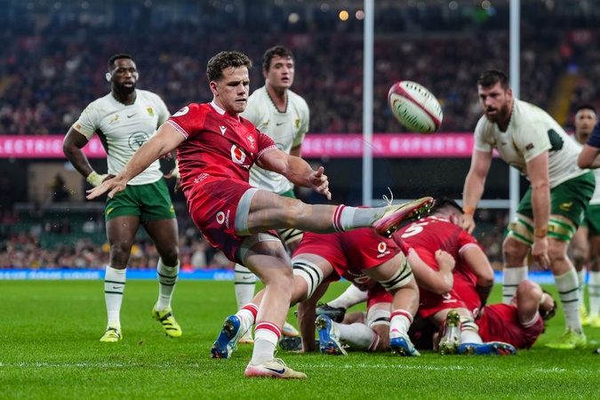 Kieran Hardy of Wales kicks the ball during the Quilter Nations Series 2025 match Wales vs South Africa at Principality Stadium, Cardiff, United Kingdom, 29th November 2025, Credit:Andrew Lewis/News Images / Avalon