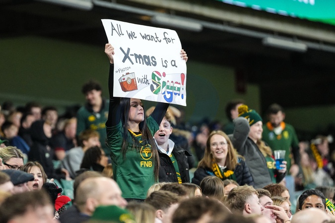 South African fans celebrate during the Quilter Nations Series 2025 match Wales vs South Africa at Principality Stadium, Cardiff, United Kingdom, 29th November 2025, Credit:Andrew Lewis/News Images / Avalon