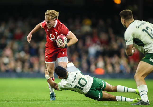 Blair Murray of Wales is tackled by Sacha Feinberg-Mngomezulu of South Africa during the Quilter Nations Series 2025 match Wales vs South Africa at Principality Stadium, Cardiff, United Kingdom, 29th November 2025, Credit:Andrew Lewis/News Images / Avalon