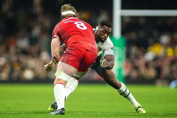 Aaron Wainwright of Wales is tackled by Siya Kolisi of South Africa during the Quilter Nations Series 2025 match Wales vs South Africa at Principality Stadium, Cardiff, United Kingdom, 29th November 2025, Credit:Andrew Lewis/News Images / Avalon