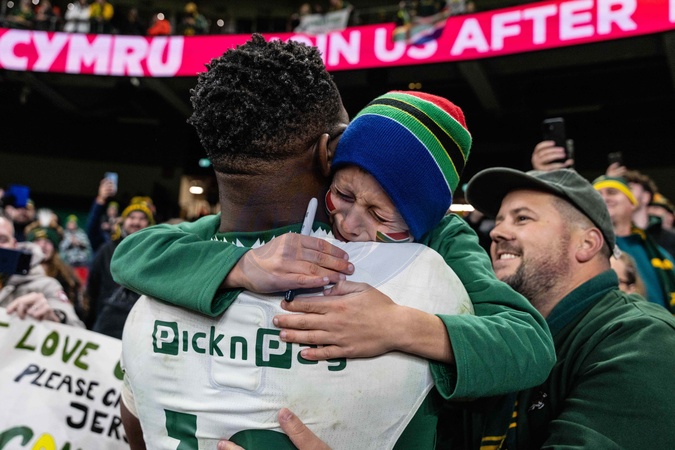 Siya Kolisi of South Africa embraces a young fan during the Quilter Nations Series 2025 match Wales vs South Africa at Principality Stadium, Cardiff, United Kingdom, 29th November 2025, Credit:Andrew Lewis/News Images / Avalon
