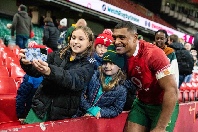 Damian Willemse of South Africa has a selfie with fans during the Quilter Nations Series 2025 match Wales vs South Africa at Principality Stadium, Cardiff, United Kingdom, 29th November 2025, Credit:Andrew Lewis/News Images / Avalon