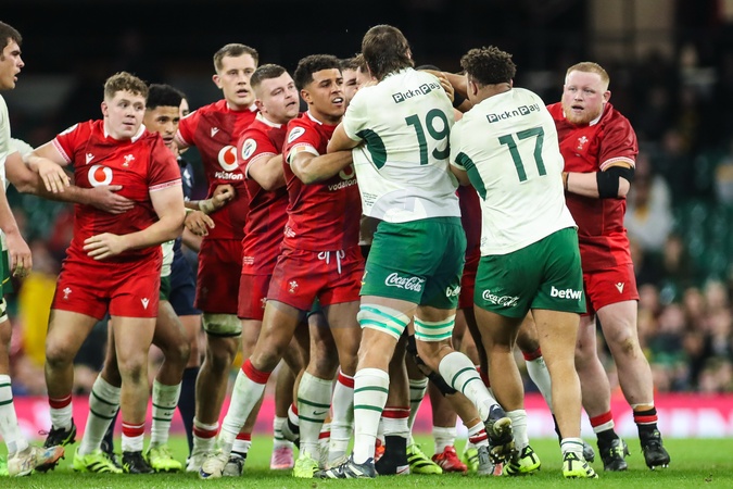 Eben Etzebeth of South Africa and Alex Mann of Wales get into a heated exchange during the Quilter Nations Series 2025 match Wales vs South Africa at Principality Stadium, Cardiff, United Kingdom, 29th November 2025, Credit:Andrew Lewis/News Images / Avalon