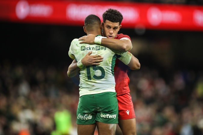Rio Dyer of Wales and Damian Willemse of South Africa embrace at the final whistle during the Quilter Nations Series 2025 match Wales vs South Africa at Principality Stadium, Cardiff, United Kingdom, 29th November 2025, Credit:Andrew Lewis/News Images / Avalon
