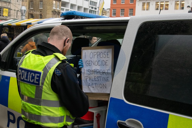 Cambridge, UK, 29th November 2025 - Defend Our Juries protestors arrested in Cambridge as they show support for the proscriped organisation, Palestine Action, as a part of the groups "Lift The Ban" campaign, a campaign calling for the de-proscription of Palestine Action,., Credit:Will Colebourne / Avalon