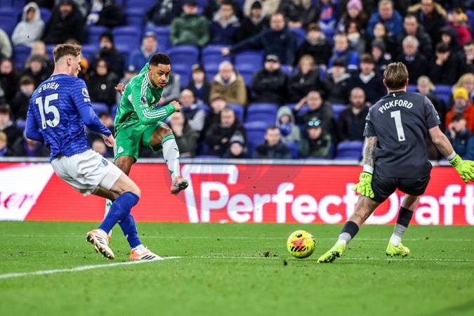 Jacob Ramsey of Newcastle United has his shot blocked by Everton goalkeeper Jordan Pickford during the Premier League match Everton vs Newcastle United at Hill Dickinson Stadium, Liverpool, United Kingdom, 29th November 2025, Credit:Ae Cosgrove/News Images / Avalon