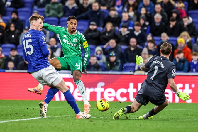 Jacob Ramsey of Newcastle United has his shot blocked by Everton goalkeeper Jordan Pickford during the Premier League match Everton vs Newcastle United at Hill Dickinson Stadium, Liverpool, United Kingdom, 29th November 2025, Credit:Ae Cosgrove/News Images / Avalon